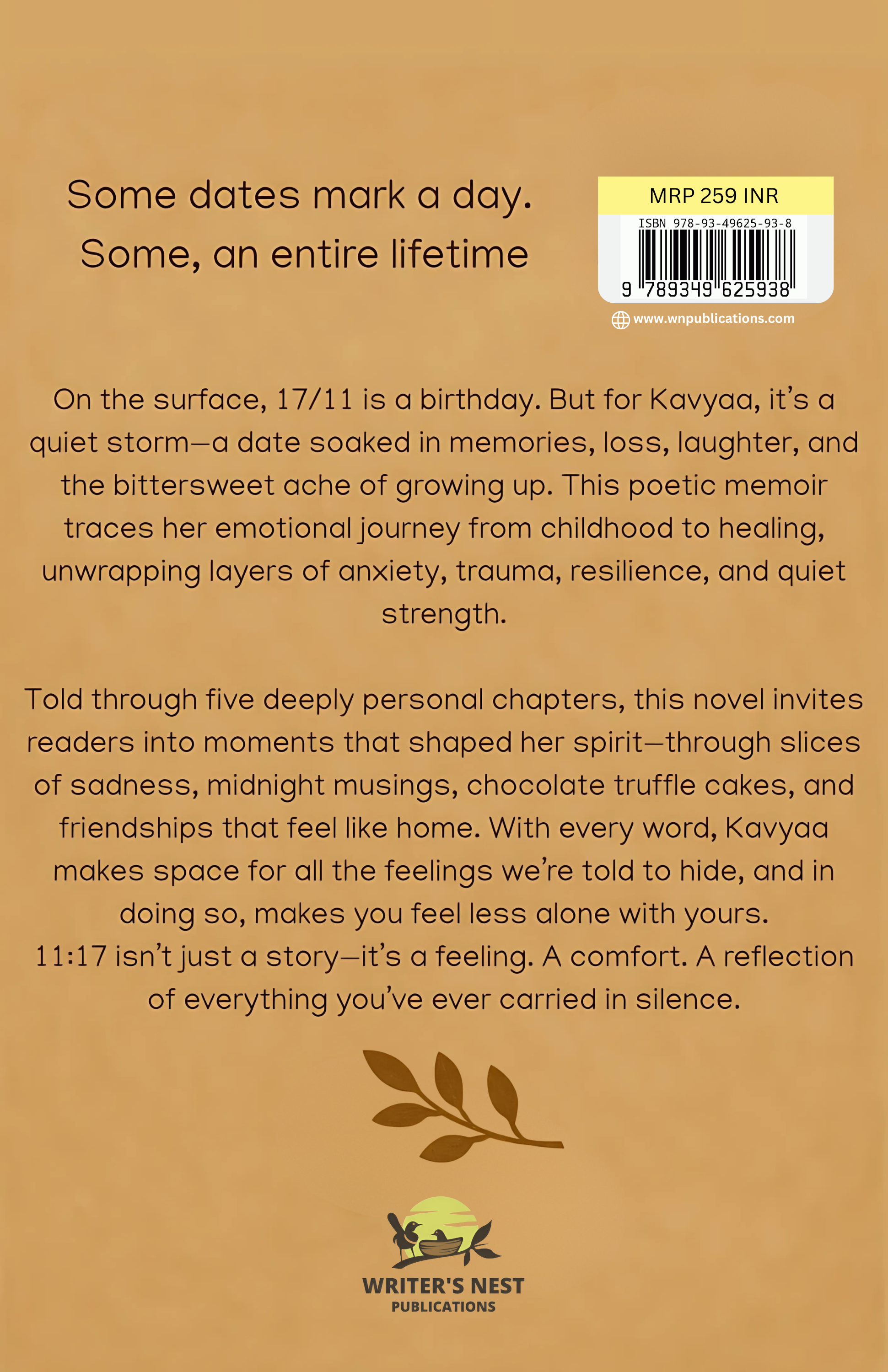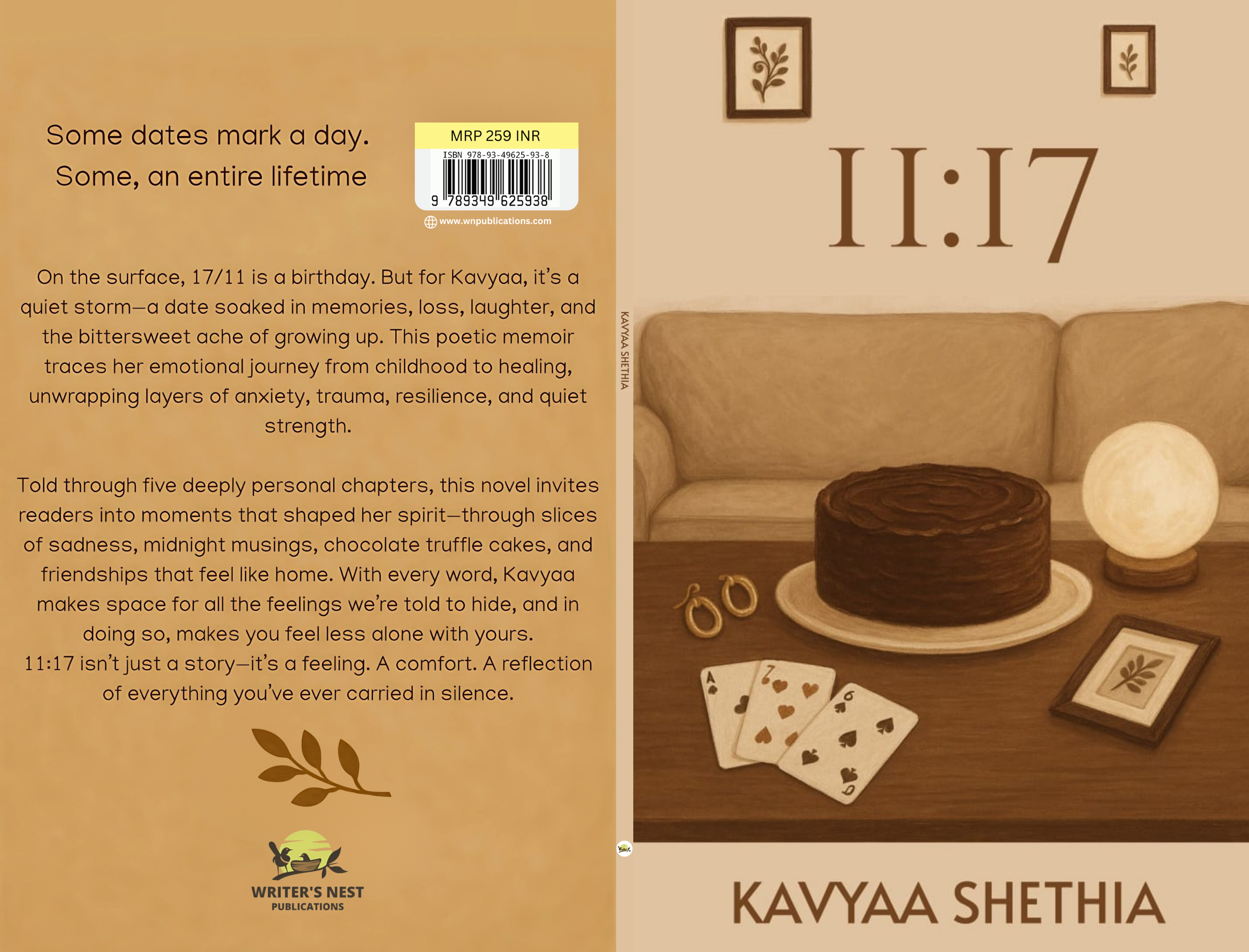 “On the surface, 17/11 is a birthday. But for Kavyaa, it’s a quiet storm—a date soaked in memories, loss, laughter, and the bittersweet ache of growing up. This poetic memoir traces her emotional journey from childhood to healing, unwrapping layers of anxiety, trauma, resilience, and quiet strength. Told through five deeply personal chapters, this novel invites readers into moments that shaped her spirit—through slices of sadness, midnight musings, chocolate truffle cakes, and friendships that feel like home. With every word, Kavyaa makes space for all the feelings we’re told to hide, and in doing so, makes you feel less alone with yours. 11:17 isn’t just a story—it’s a feeling. A comfort. A reflection of everything you’ve ever carried in silence.”